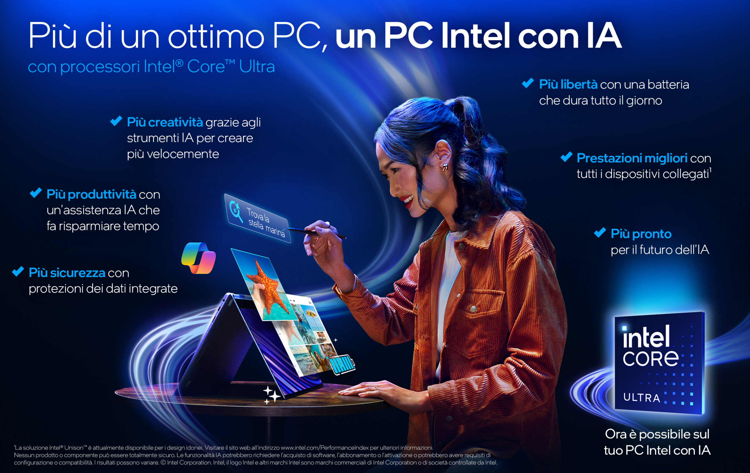 I processori Intel® Core™ Ultra sono concepiti per renderti un leader nell’Intelligenza Artificiale. Dalla produttività potenziata all’aumento della sicurezza e della velocità, l’Intelligenza Artificiale di Intel è la chiave per